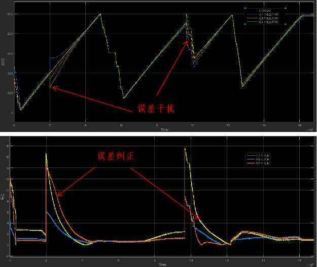 左图是对一个系统中的三节电池进行验证的效果图,图中真实值为黄色曲线,红、绿、蓝为三节电池曲线。在第一次充电SOC=40%时,对系统结果人为修改,对蓝、绿电池添加了正15%和负15%的偏差,可以看到误差曲线马上跳到了17%,然后迅速被拉回。再次在SOC=90%的点插入误差,正10%、负10%、负20%,也可以看到误差被迅速拉低,系统表现出误差干扰非常好的鲁棒性。